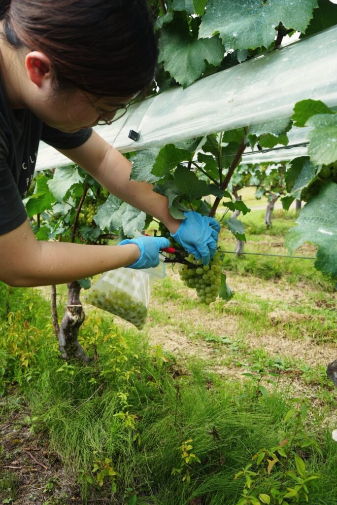 収穫前は、糖度や酸度などの数値を測るだけでなく、粒を口に含み、皮の厚みや種の香りまで何度も確かめます。